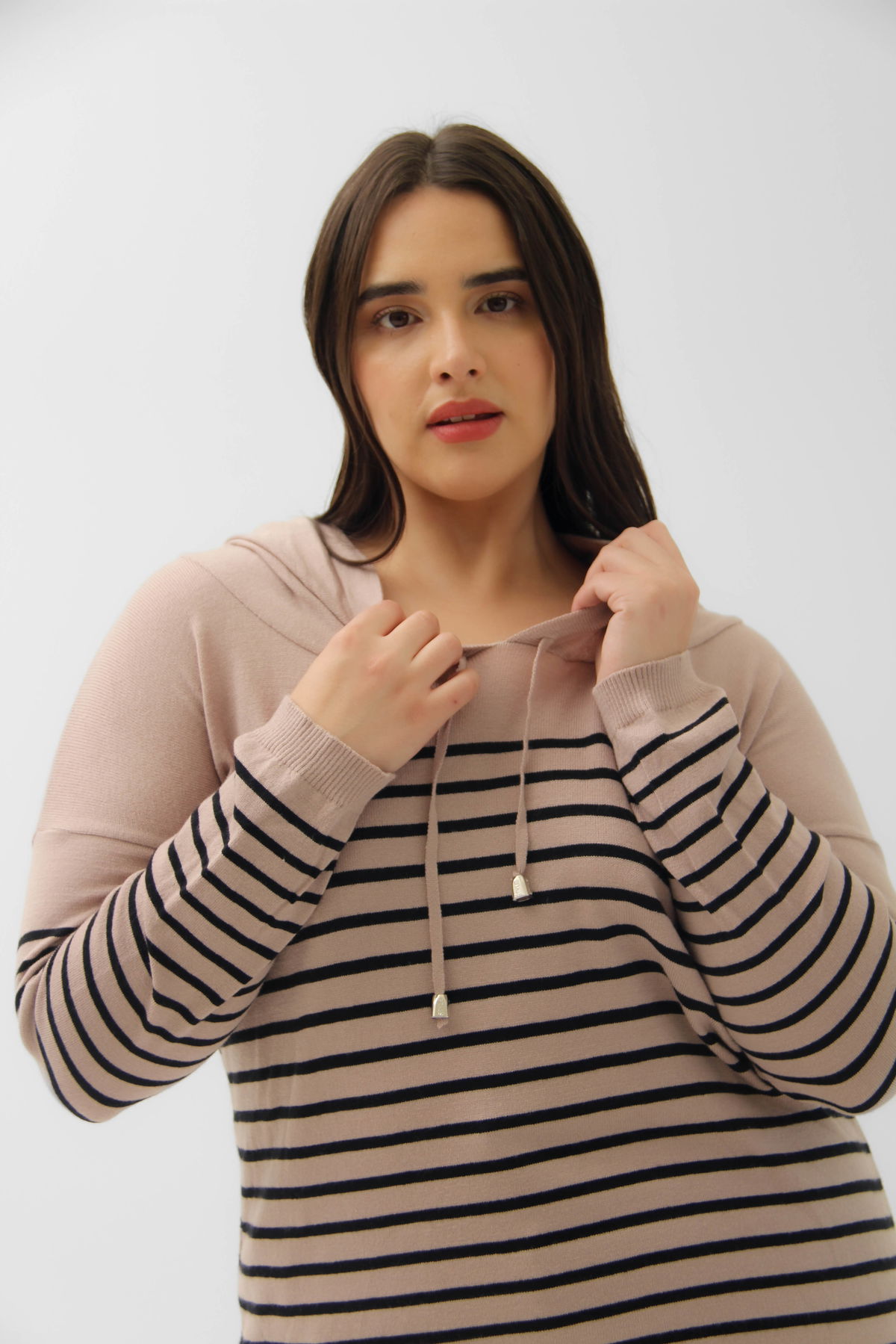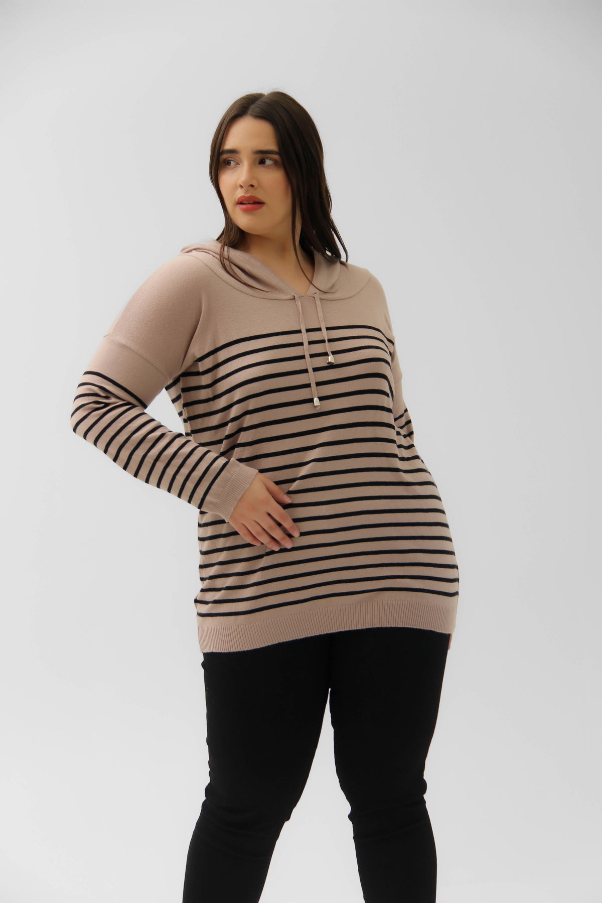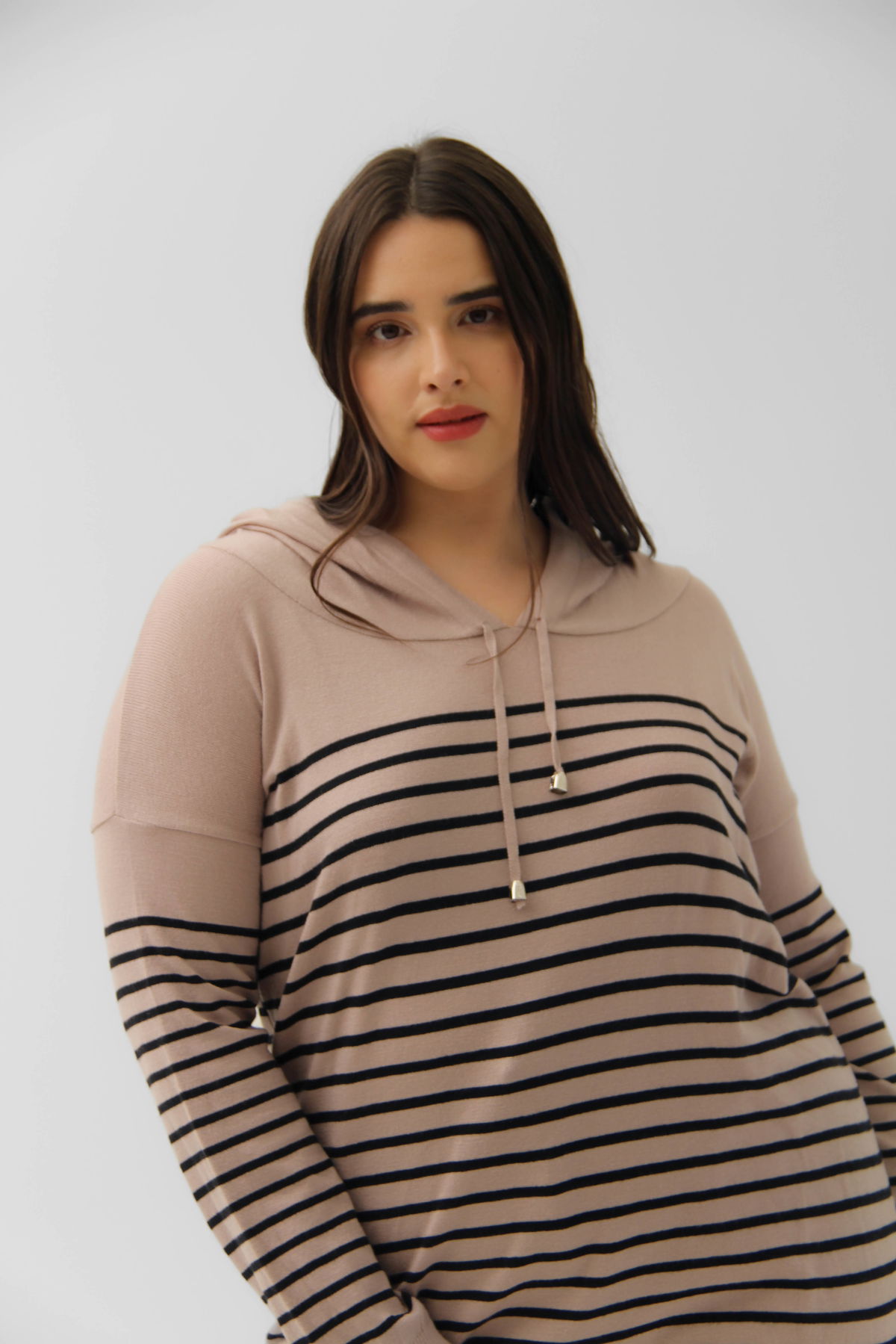 Sweater oversize con capucha rayada confeccionado en hilo bremer.