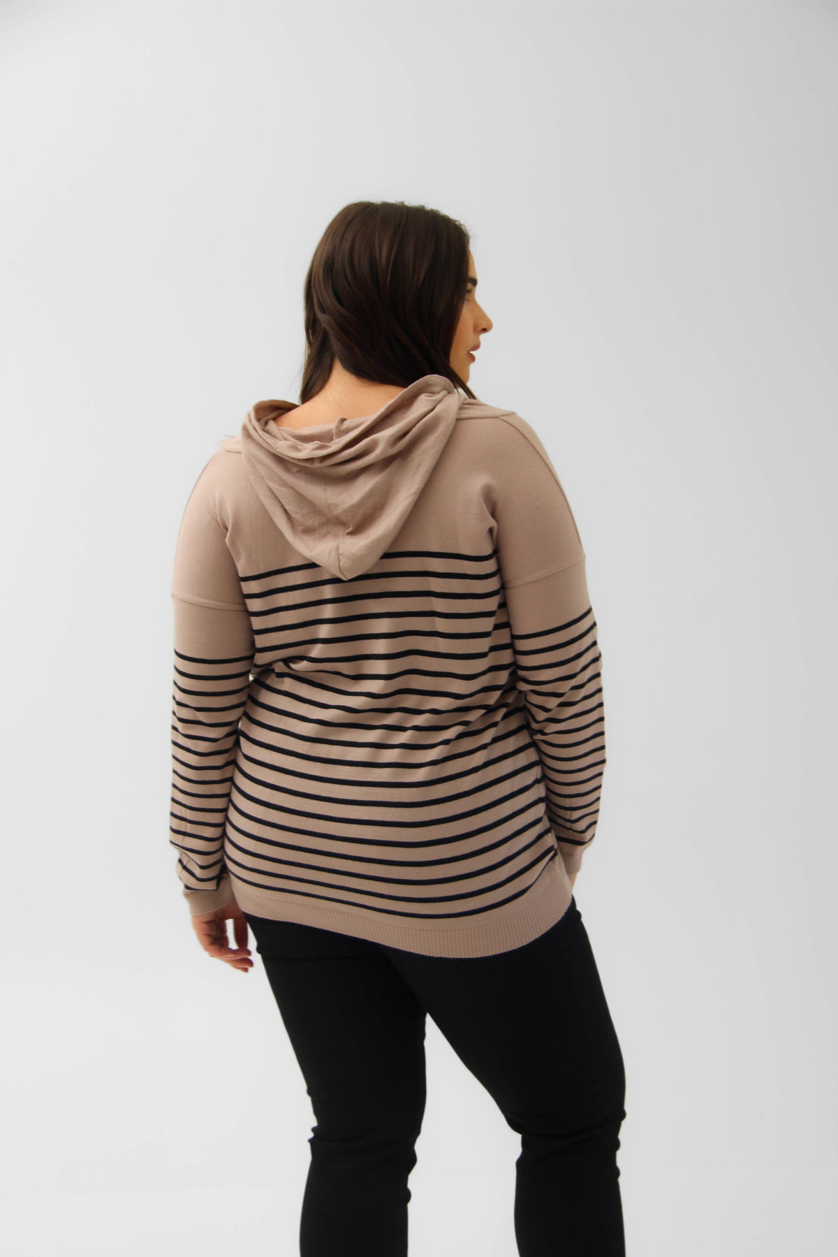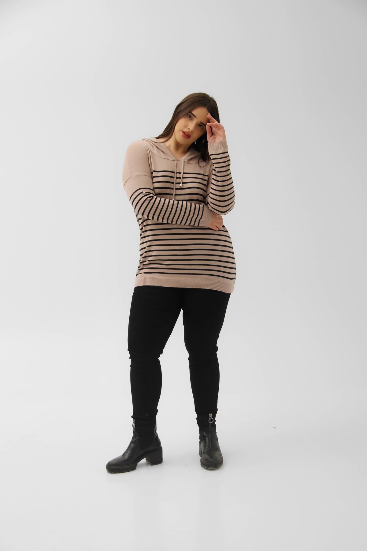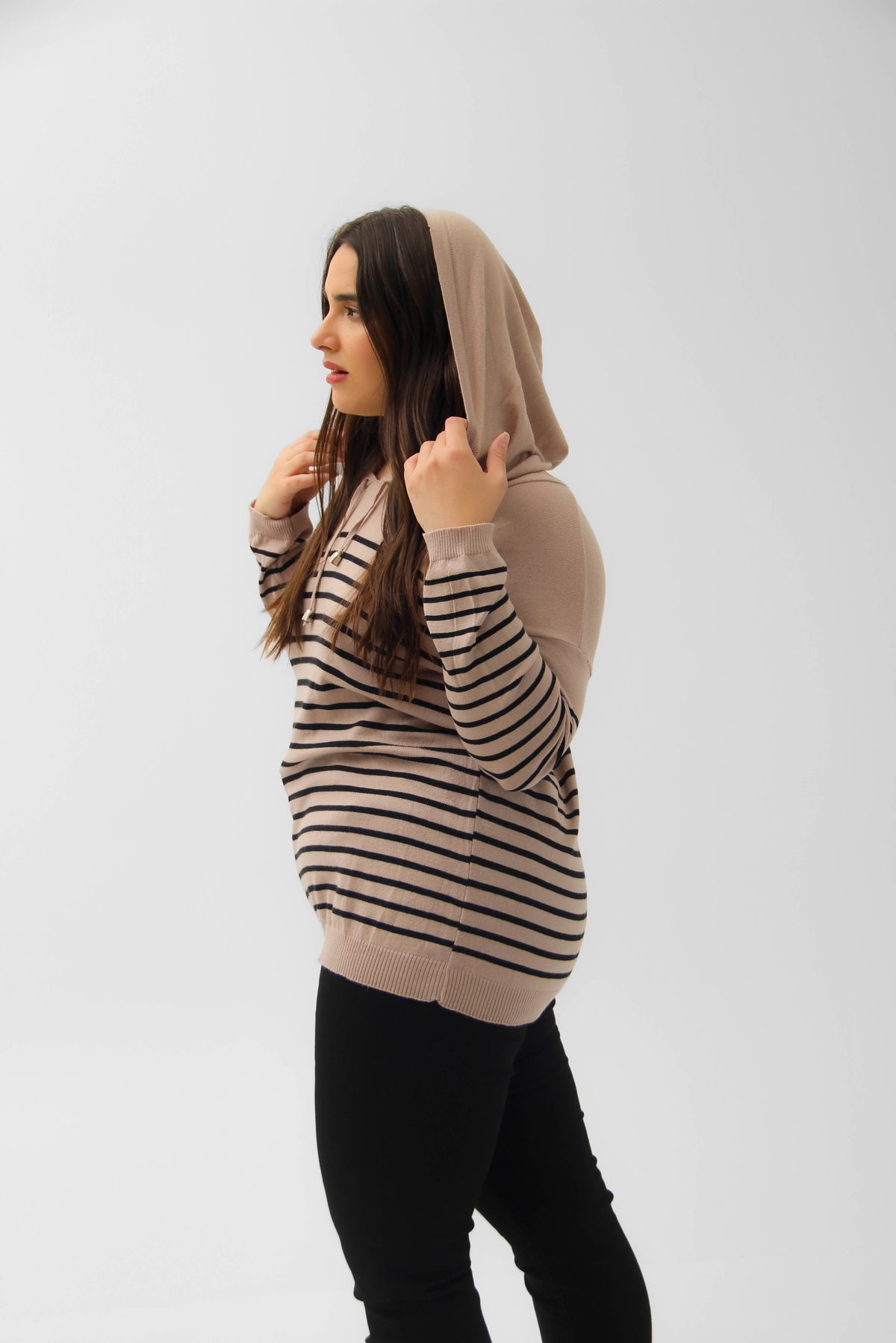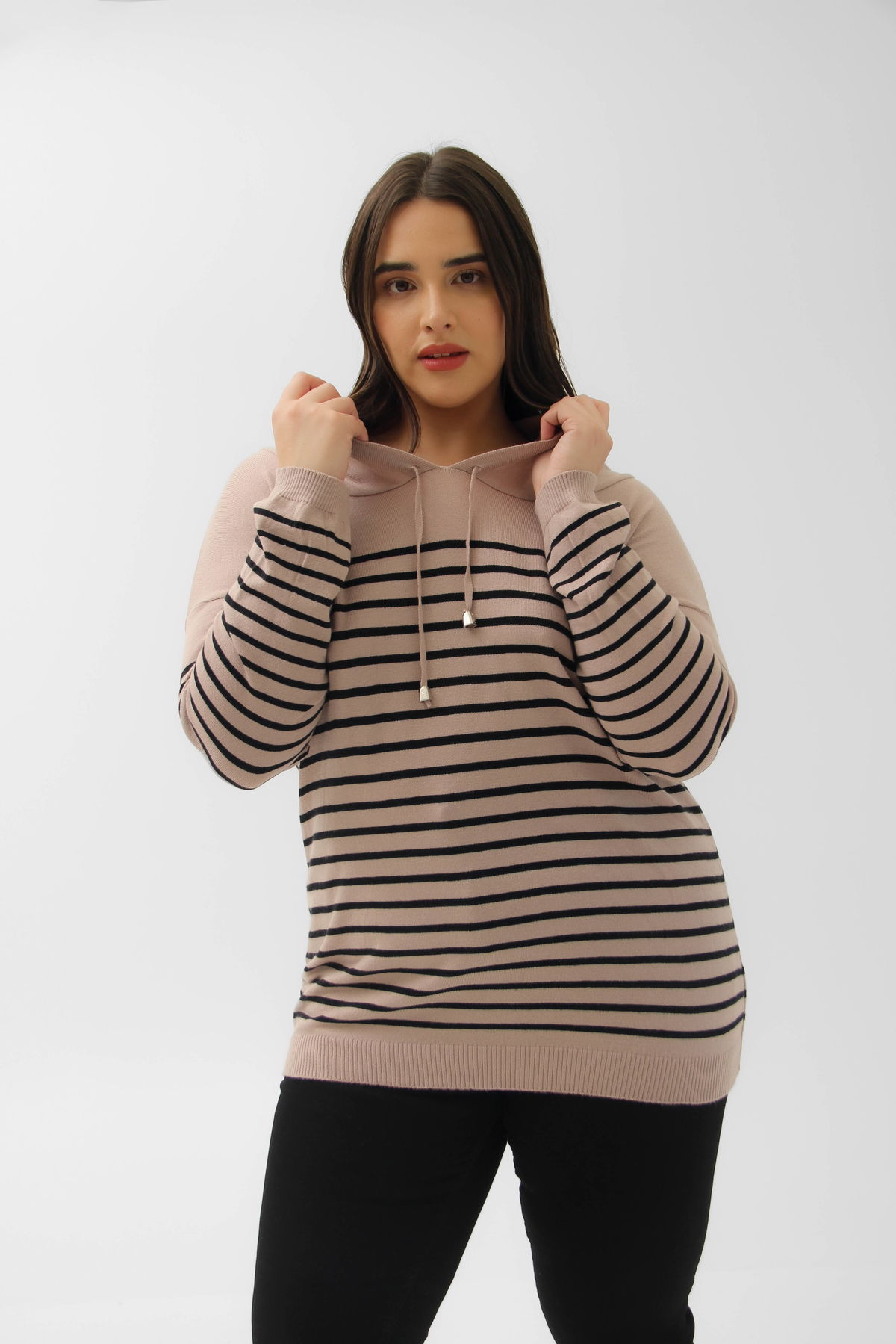 Sweater oversize con capucha rayada confeccionado en hilo bremer.