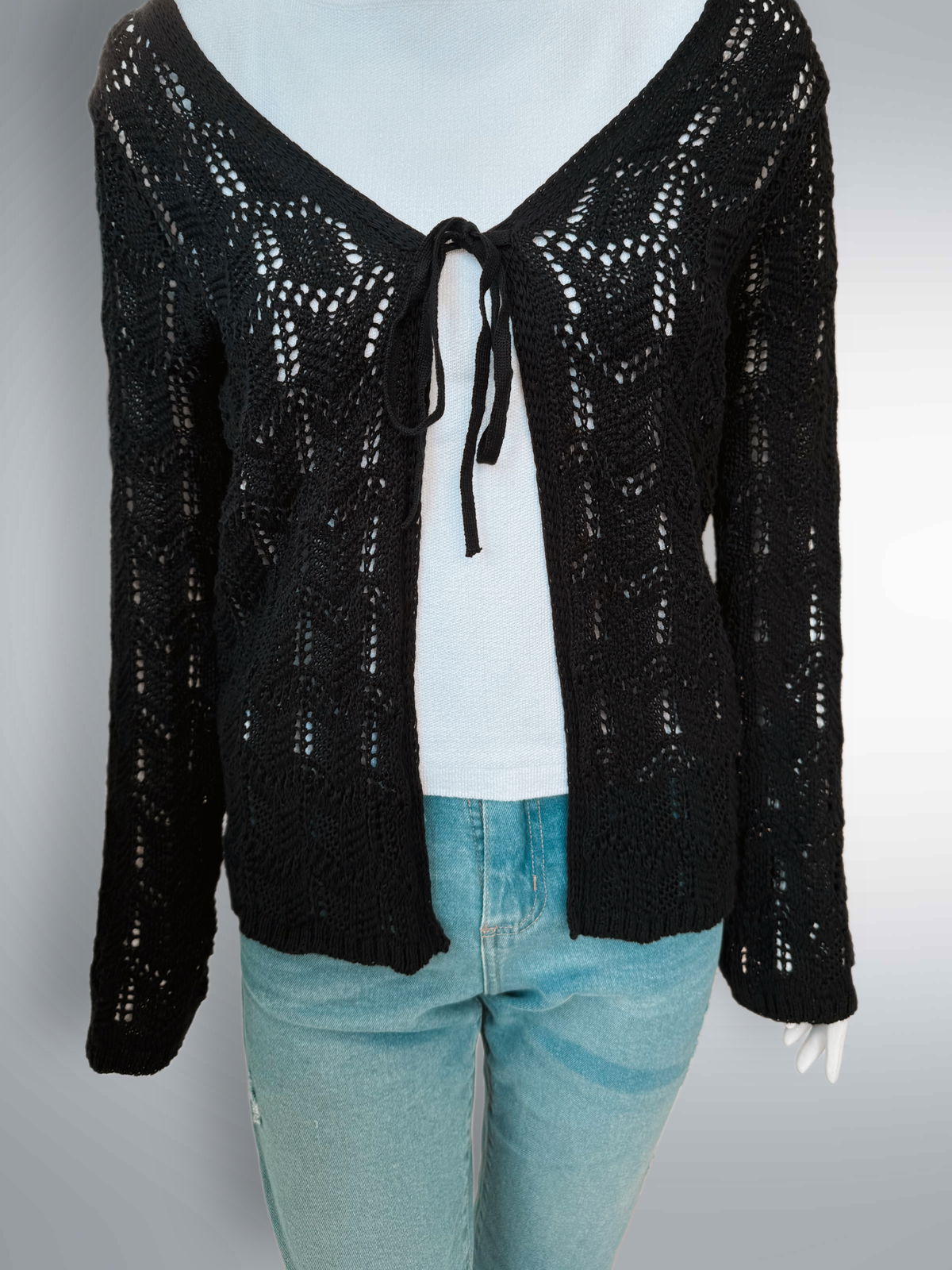 Saco abierto de algodón calado con laso súper suave. Prenda liviana, cómoda y moderna.